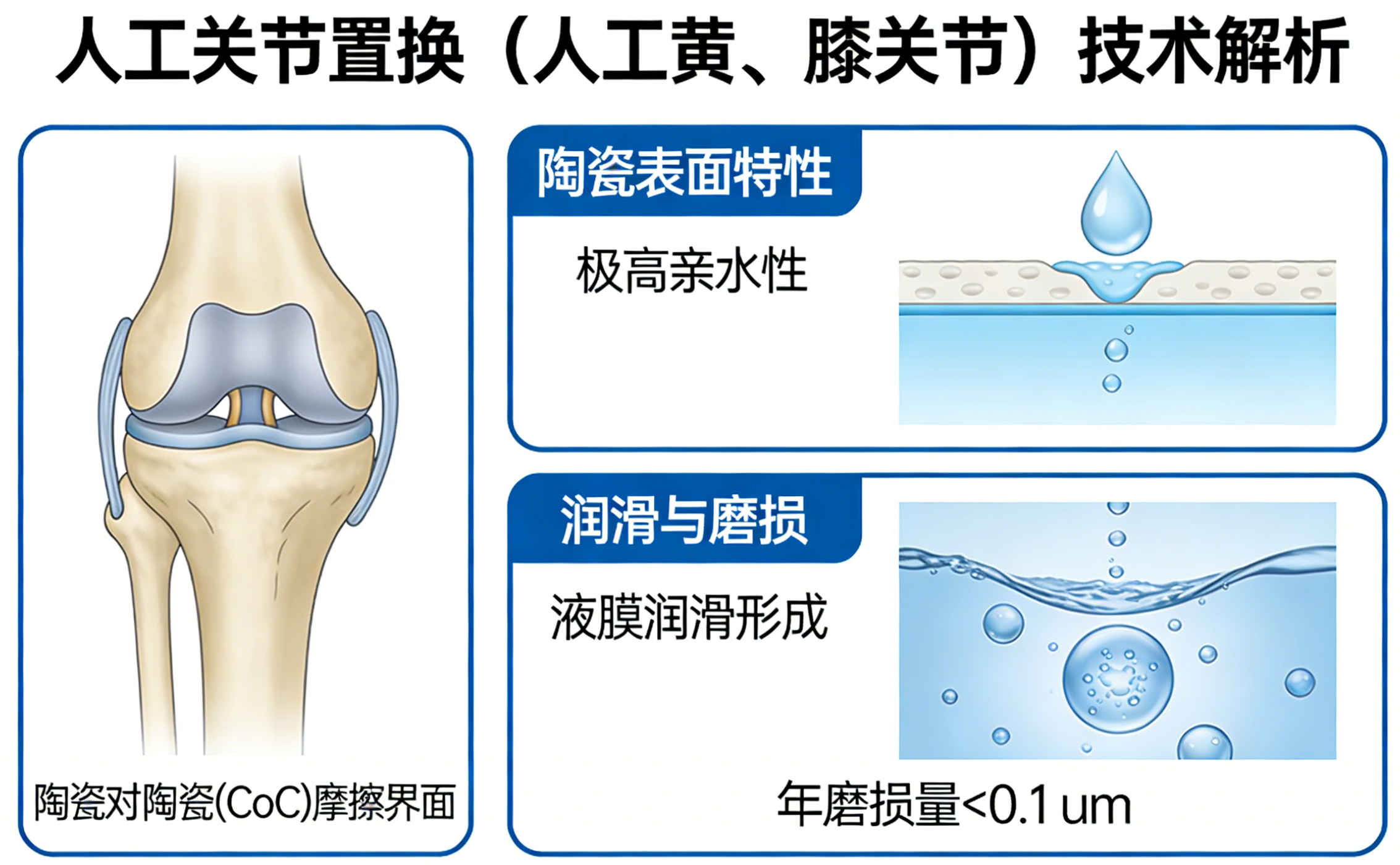 Interfejs cierny ceramika-ceramika (CoC) jest obecnie uznawany za najlepsze rozwiązanie. Ze względu na wyjątkowo wysoką hydrofilowość powierzchni ceramicznej, pomiędzy złączami może tworzyć się ciekły film smarujący, a jego roczna objętość zużycia jest zwykle mniejsza niż 0,1 mikrona , wydłużając oczekiwaną długość życia importowanych obiektów z 15 lat do ponad 30 lat. 2. Precyzyjna odbudowa zębów