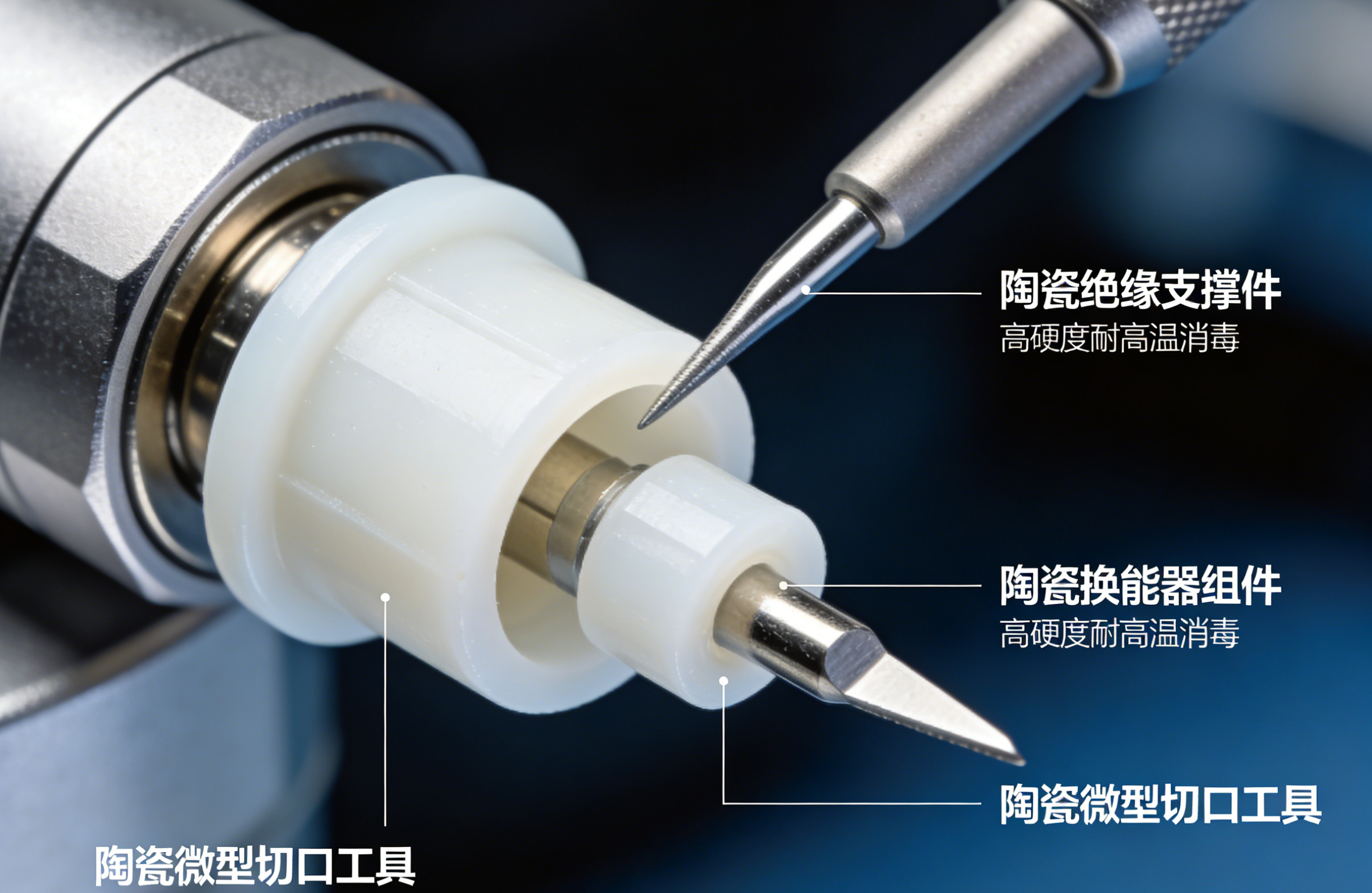 We wbudowanym wzierniku, osteotomie ultradźwiękowym i mikroczujnikach część ceramiczna zawiera wspornik izolujący lub zespół przetwornika. Jego wysoka twardość pozwala na tworzenie precyzyjnie ostrych i wytwornych mikroform, nie tracąc przy tym twardości podczas sterylizacji w wysokiej temperaturze jak narzędzia metalowe. 4. Obrazowanie elementów sprzętu diagnostycznego
